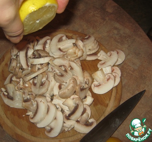 Шампиньоны промыть в воде с добавлением лимонного сока, нарезать, сбрызнуть оставшимся соком и перемешать (сок примерно делю пополам.. вообще я всегда давлю с половины большого лимона-это две столовые ложки)