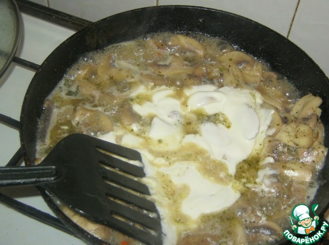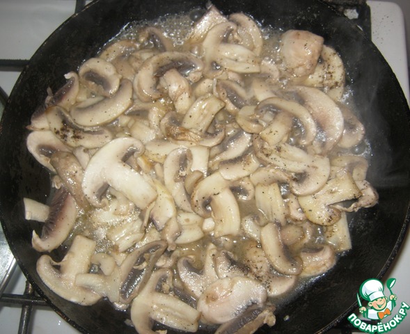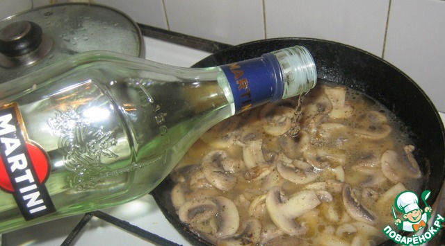 В сковородку, где жарятся грибы, влить "Мартини", перемешать, дать немного прожариться