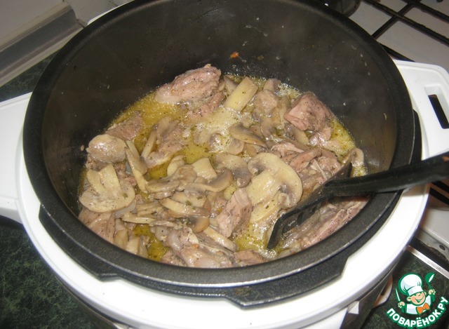 Смешиваем мясо в чаше мультиварки с грибами и включаем режим "Тушение" на 40 минут