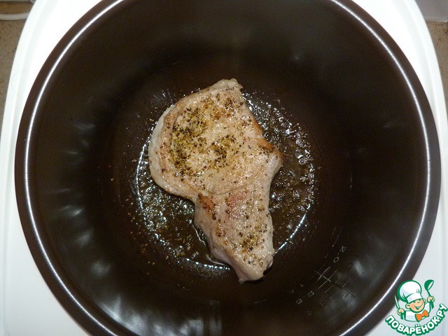 Включаем мультиварку на режим "жарка". В чашу налить немного оливкового масла, и через несколько минут разогрева выкладываем в чашу мясо для обжарки. Обжариваем свинину с каждой стороны примерно по 7-10 минут.