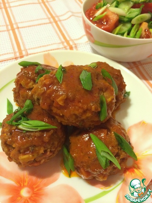 Выключить программу поджаривание. В чашу мультиварки, в обжаренные шарики, влить разведенную томатную пасту. Если шарики не будут покрыты целиком, долить немного воды. Включить программу мультиповар на 130 градусов на 30 минут.