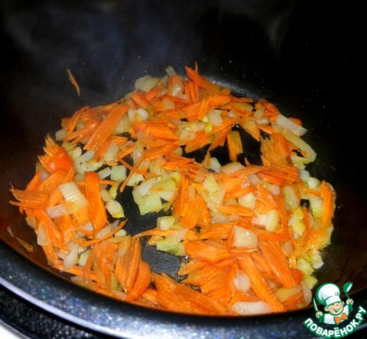 Лук и морковь почистить, лук нарезать кубиком, морковь натереть на крупной терке. Отправить овощи обжариваться в мультиварку на раст. масле до прозрачности лука (на режиме Жарка).