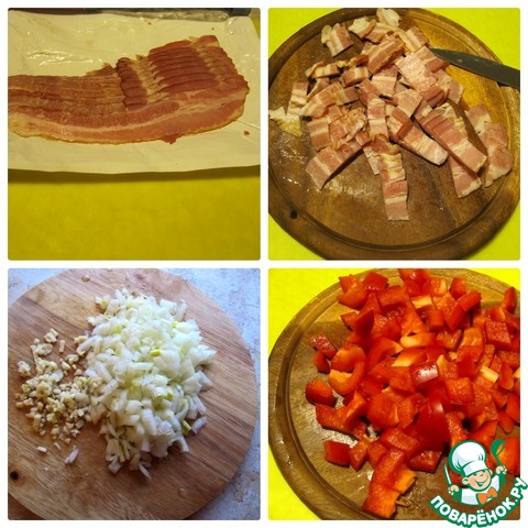 Бекон нарезать произвольно на полоски, лук накрошить кубиком, чеснок измельчить, перец очистить и нарезать крупным кубиком.