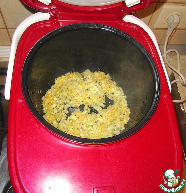 В режиме "поджаривание" обжарить лук на растительном масле.