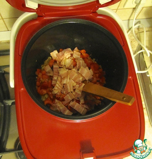 Добавить нарезанный болгарский перец, бекон, обжарить несколько минут.