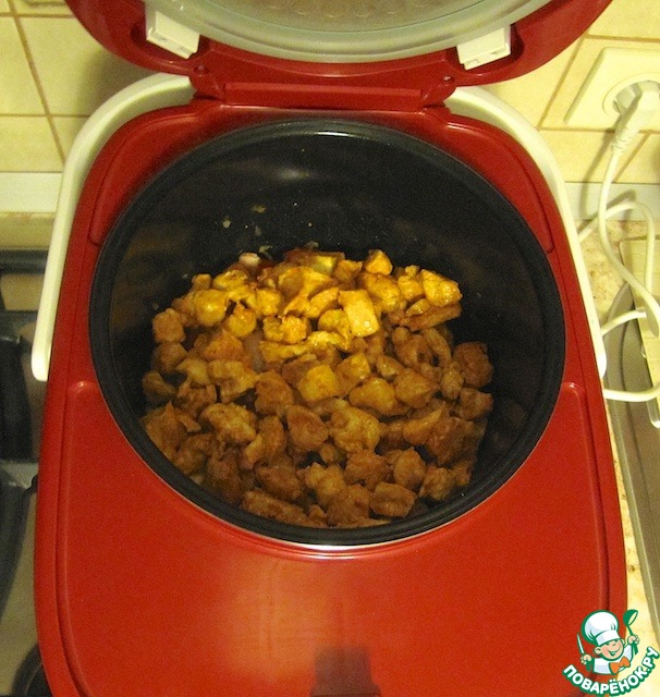 Куриное филе нарезать кубиком, посолить по вкусу, посыпать сладкой паприкой. Включить режим "поджаривание", влить растительное масло, подготовленное мясо обжарить до золотистого цвета, переложить в блюдо, накрыть фольгой.
