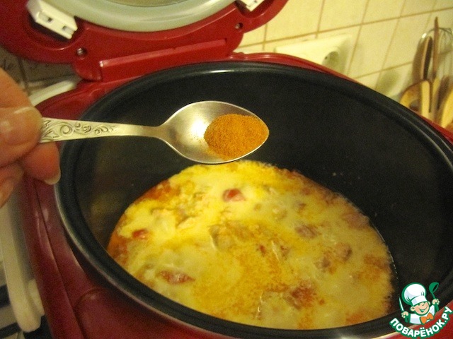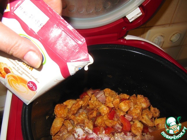 Влить 300 мл сливок (100 мл оставить), все перемешать, попробовать на вкус. Включить режим "тушение" на 50 минут.