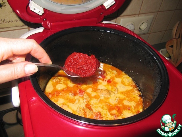 Добавить 1 столовую ложку томатной пасты (не кислой!!!). Продолжить тушение.