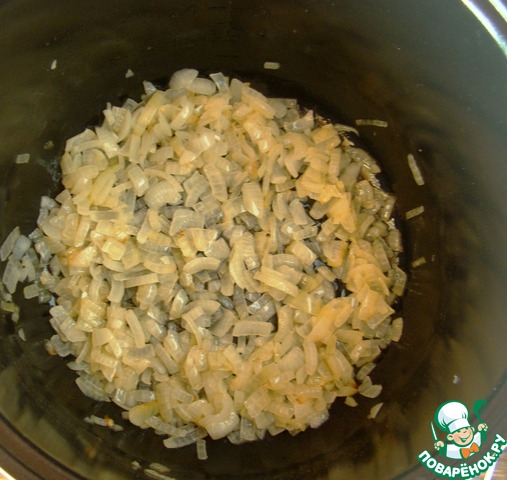 Луковицу очищаем и мелко режем. В чашу мультиварки отправляем 1 ст. л. сливочного масла и припускаем лук на программе ЖАРКА до прозрачности Эта процедура занимает 7-10 минут. Не пережариваем!!! Мы же не хотим хрустеть обугленным луком?