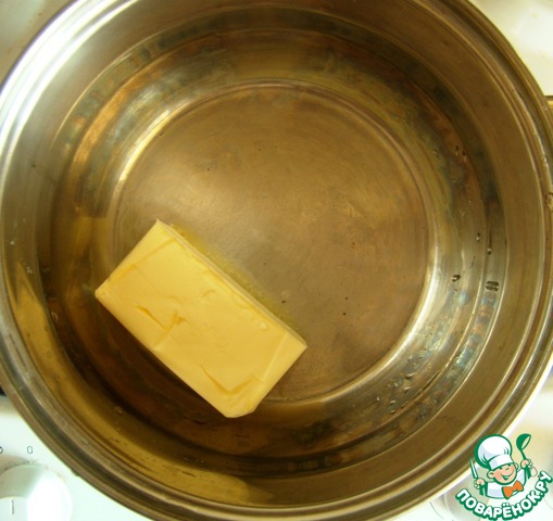 100 грамм сливочного масла отправим в сотейник и поставим на медленный огонь, пусть растопится. Потом отставим в сторонку, чтобы масло отслоилось на две части - желтую и прозрачную верхнюю и белую плотную - нижнюю.