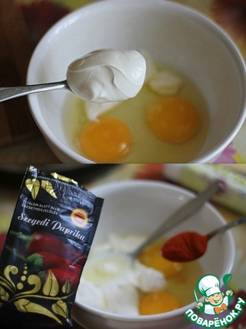 Приготовим маринад. Для этого к яйцам добавим майонез (или сметану) и молотую сладкую паприку.
