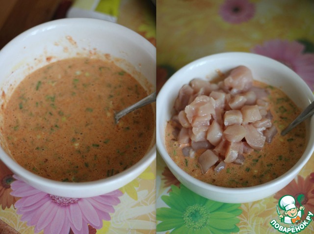 Все тщательно перемешать и в полученный маринад добавить кусочки филе. И еще раз все хорошо перемешать. Оставить мариноваться минут на 20-30.