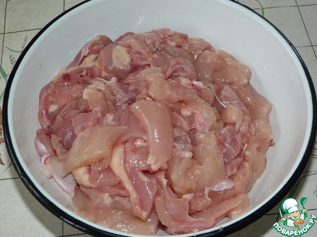 Итак, снимаем с курицы шкурку, отделяем мясо от костей и нарезаем кусочками, примерно по 2 см.