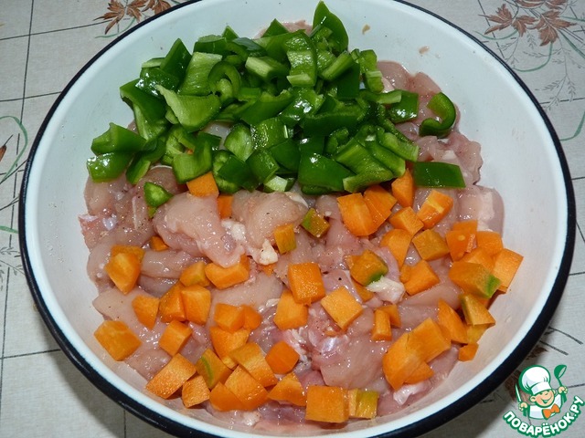 После того, как достали из холодильника курицу, добавляем к мясу кубики морковки и перца и вымешиваем, чтобы овощи равномерно распределились.