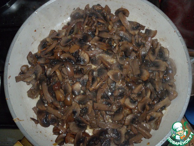 Обжариваем грибы, у меня были шампиньоны и замороженные опята. Слегка присаливаем. Если вам нельзя кушать грибы, то можно вместо них использовать порезанный кубиками болгарский перец.