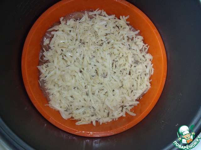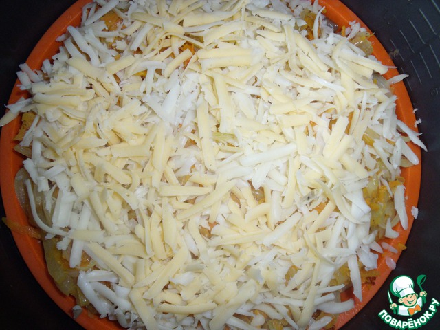 В оригинальном рецепте предлагалось выкладывать все прямо в чашу мультиварки, скажу честно - испугалась, что не смогу вытащить. И зря, за счет сыра все прекрасно держит форму и не разваливается. Eсли будете готовить в духовке, возьмите форму примерно диаметром 20-25 см. У меня силиконовая для приготовления в мультиварке с косточкой, чтобы не поцарапать чашу.