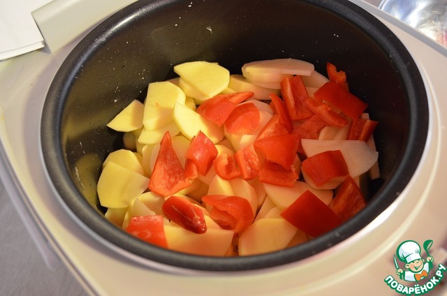 Делее порезать рулет на сегменты - рулеты. И выложить их поверх перца. Добавить в мультиварку 100 мл воды. Блюдо посолить по вкусу.