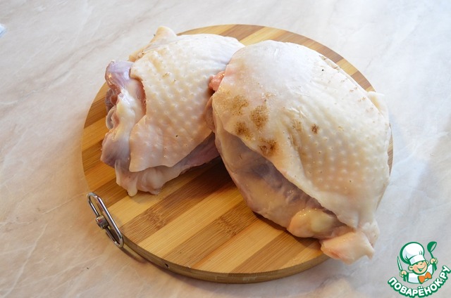 Выложить в чашу мультиварки шкуркой вниз, для того чтоб получилась аппетитная корочка.