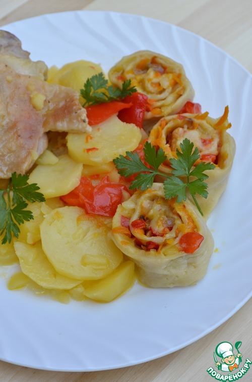 Рецепт "Индейка, картофель и штрудели с овощной начинкой":