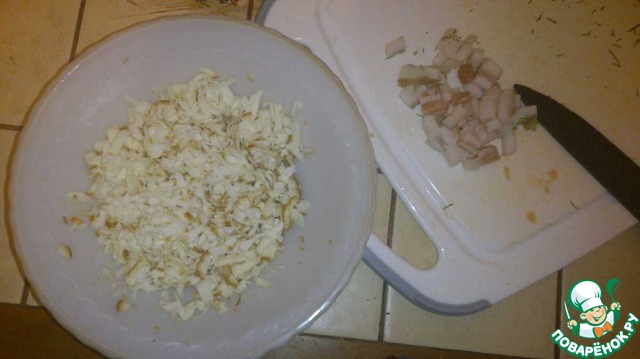Перед тем, как начать готовить, я на час в морозилку забросил сыр. Что бы легче его было тереть. Вот он уже потертый. Рядом - нарезанное настоящее украинское сало-)