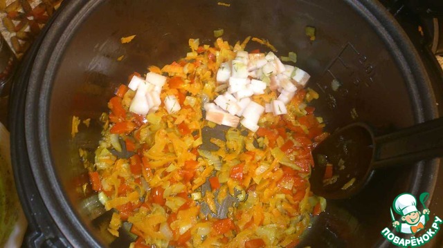 Минут через 8 добавляем сало и минут 5-7 пережариваем с овощами.