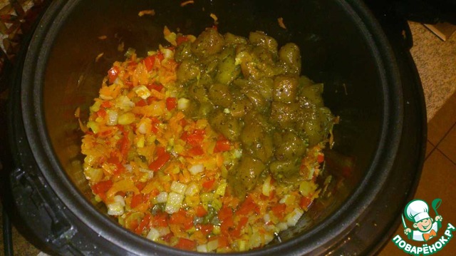 Вот и все, активная фаза готовки завершена. Теперь переводим мультю в режим "Тушение" на один час. Закидываем картошку, горох и заливаем кипятком до риски. Перемешиваем, закрываем крышку и идем пить чай.