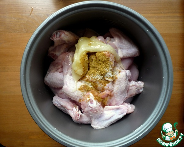 Курицу можно сразу сложить в чашу мультиварки. Добавим к ней карри, мед и соль. Оставим мариноваться на полчаса.