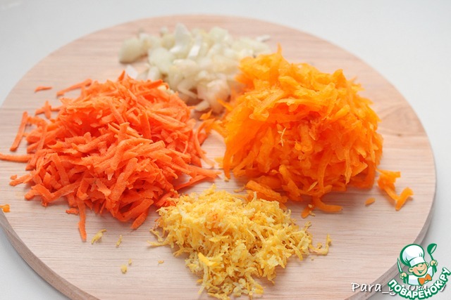 2. Морковь, тыкву натереть на терке, лук порезать мелко. Натереть цедру лимона на мелкой терке.