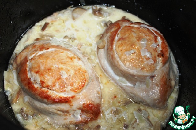 Сливки смешиваю с оставшейся часть грибов и лука. Заливаю сливочно-грибным соусом наши куриные кармашки. Включаю программу Тушение, время приготовления 25 минут. Закрываю крышку и оставляю готовиться.