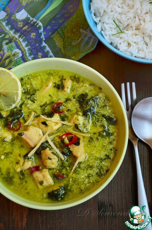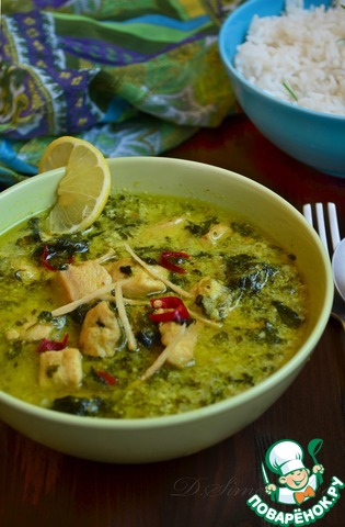 | Этот рецепт из индийской кухни, которую я очень люблю. К таким острым и ароматным блюдам в Индии принято подавать пресный отварной рис в отдельной посуде, который смягчит и подчеркнет ярко выраженный вкус курицы в шпинате. |