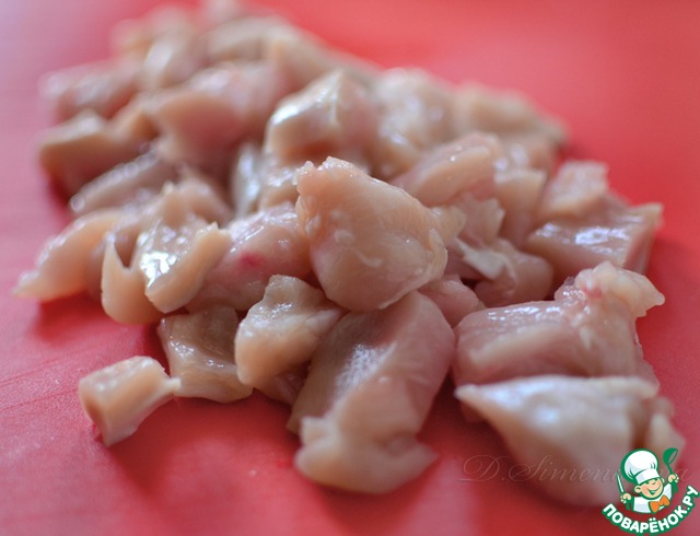 Куриное филе промыть, обсушить, нарезать небольшими кусочками.