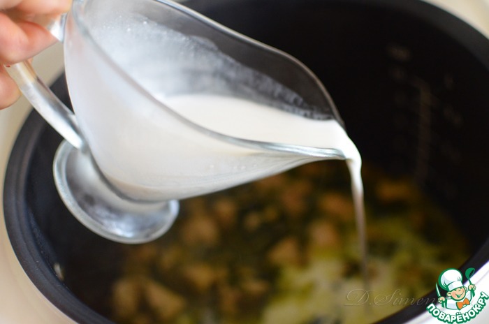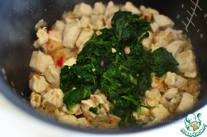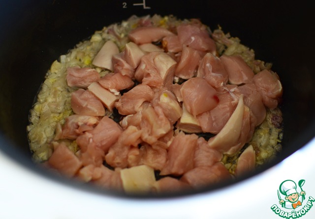 Включим режим Поджаривание, нальем в чашу немного масла и дождемся его нагрева. Обжарим лук и чеснок около 2-3 минут. За этим режимом мы следим сами, как если бы жарили в сковороде, поэтому не оставляйте мультиварку без присмотра и помешивайте специальной лопаточкой. К луку и чесноку добавим куриное филе и обжарим всё вместе около 5-7 минут.