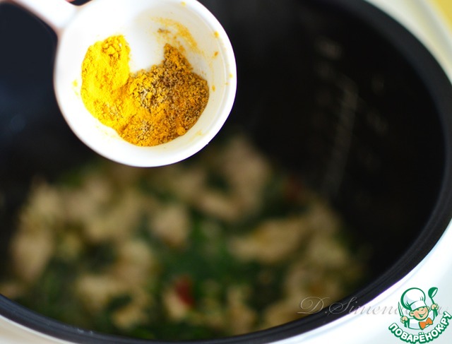 Следом специи (куркуму, кориандр и кумин), перемешать, перевести мультиварку в режим Тушение и тушить около 10 минут.