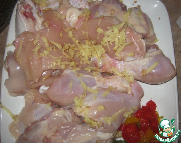 Натираем имбирь на крупную тёрку и хорошо перемешиваем с куриным мясом, даём постоять минут 30