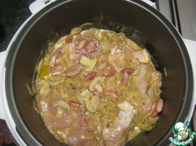 Соединяем грибы, цыплёнка и фасоль (замоченная и предварительно проваренная отдельно минут 15)перемешиваем.