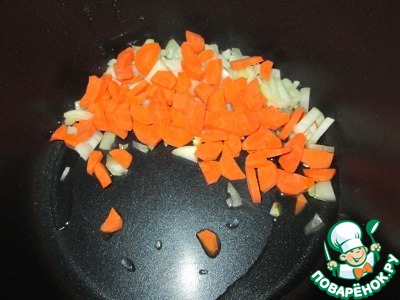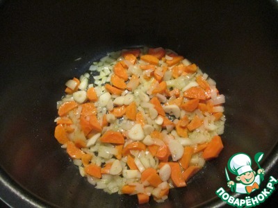 В чашу мультиварки налить немного растительного масла и отправить в нее лук-морковь. Установить режим жарка (обжаривание)