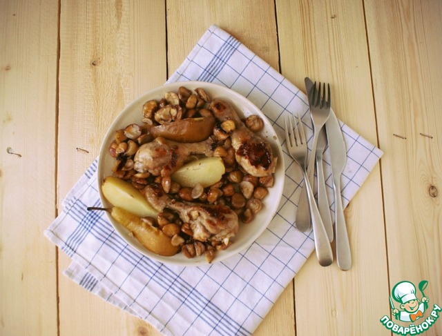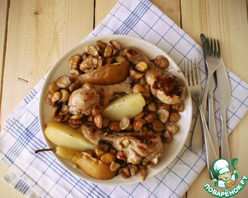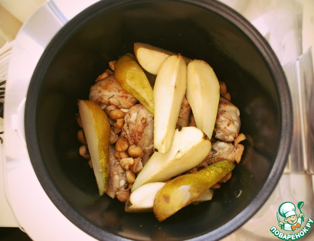 На режиме выпечка сначала обжарить курицу с оливковым маслом (минут 15 до золотистости), потом добавить каштаны, груши и немного воды (готовить до окончания программы).