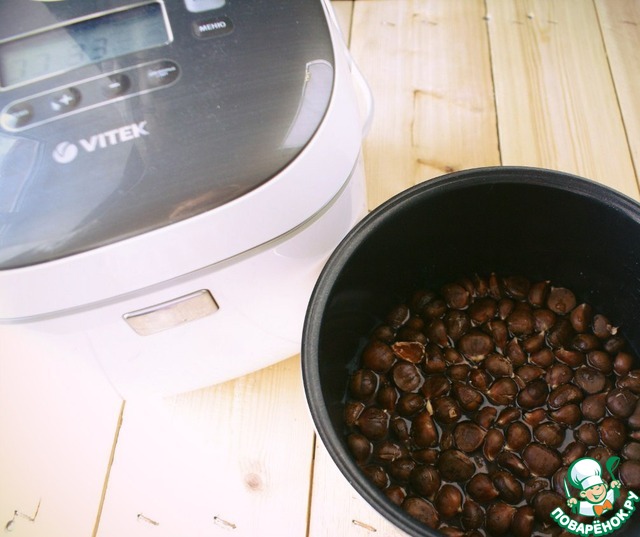 В чашу мультиварки наливаем литр воды, кидаем туда каштаны. Ставим на программу суп на 50 минут.