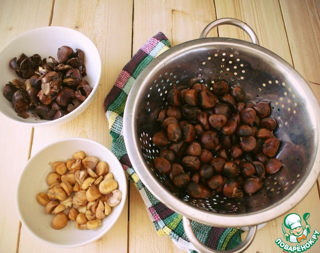 Готовые каштаны откидываем на дуршлаг и чистим от скорлупы.