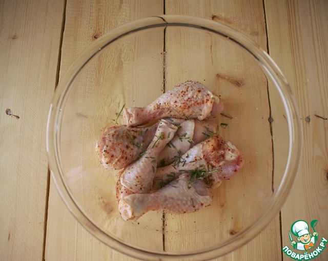 Курицу посолить крупной солью, приправить красным перцем или смесью приправ для курицы, сбрызнуть оливковым маслом и добавить свежий розмарин.