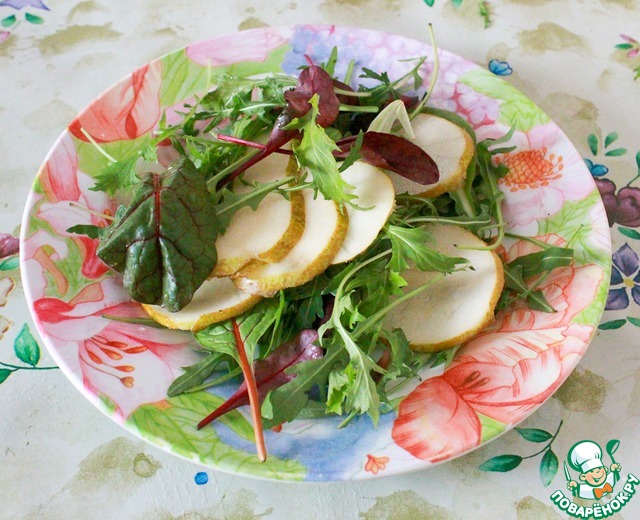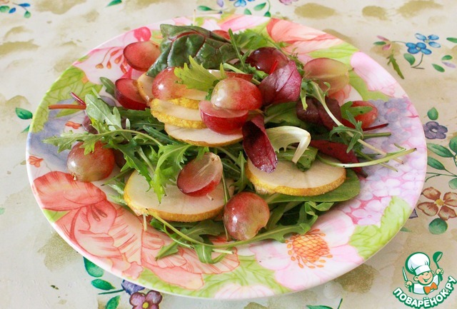 | Лёгкий салат с интересным сочетанием свежей зелени, груши, винограда и куриных фрикаделек в сырной панировке, сваренными на пару в мультиварке. |