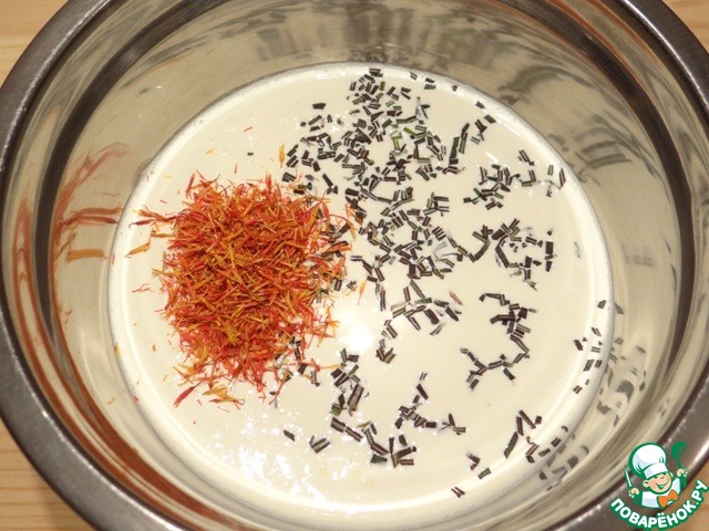 В миску наливаю сливки, добавляю розмарин и шафран.