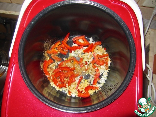 Добавить к нему болгарский перец, чеснок, имбирь, специи, перец чили - продолжить обжаривание.