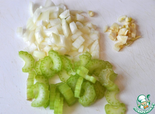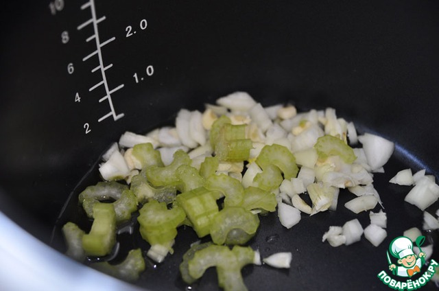 В чашу мультиврки наливаем растительное масло, после нагрева добавляем порезанные овощи и обжариваем пару минут.