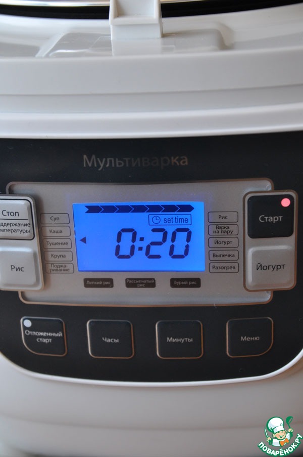 Закрываем мультиварку крышкою. Выбираем на меню режим "Тушение" и включаем на 20 минут.