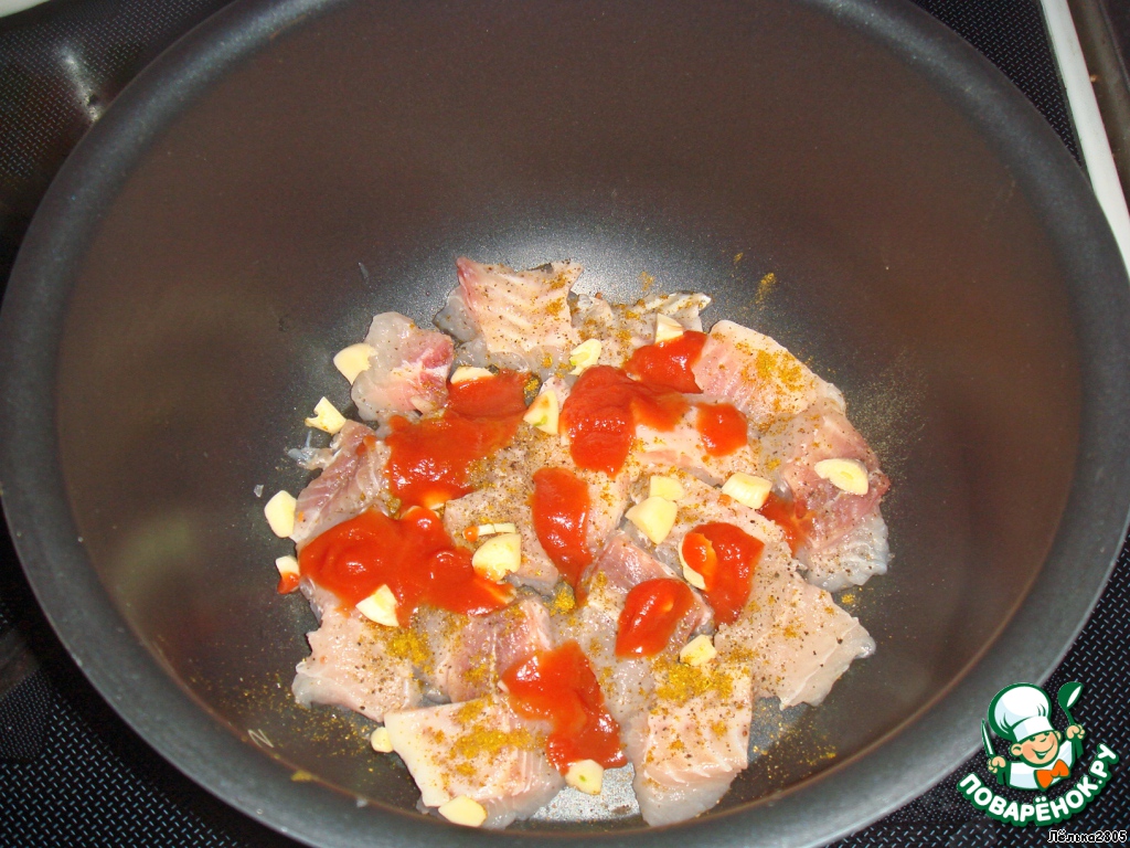 Рыбу нарезать небольшими кусочками, выложить в кастрюльку или форму.