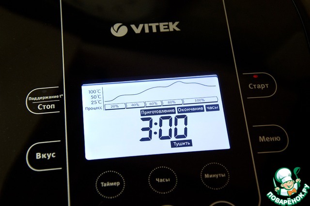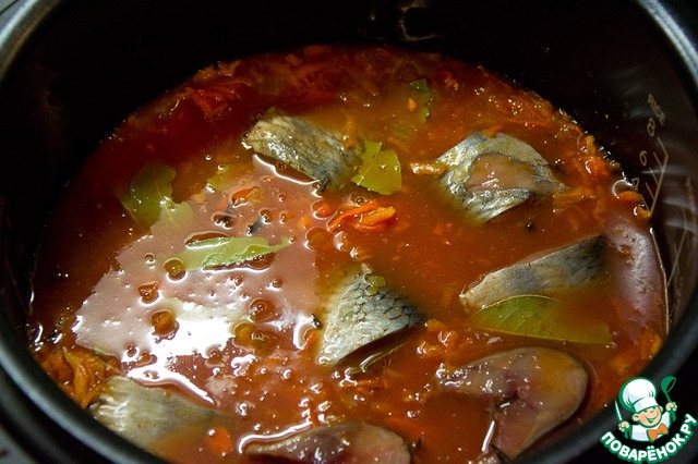 Ставим на режим тушение (4,5 часа). Периодически проверяйте рыбку, если жидкости мало, добавьте еще сок.