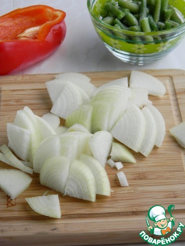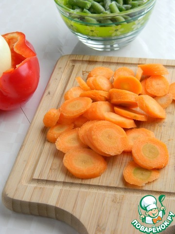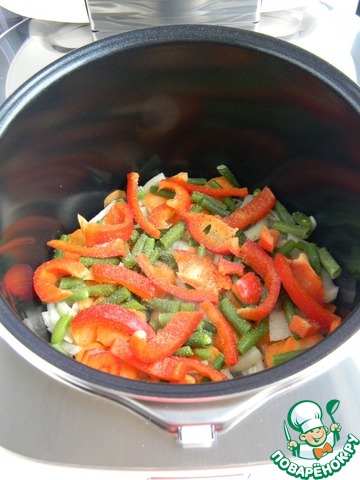 На дно чаши выкладываем лук, морковь, перец и фасоль, слегка присолить.