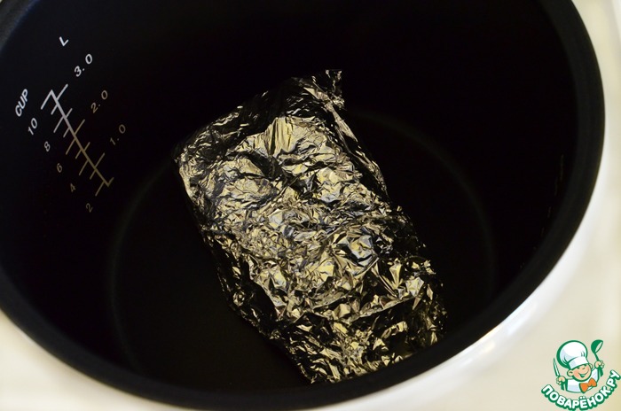 Тщательно завернуть рыбу в фольгу и уложить на дно чаши.