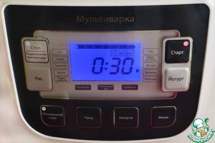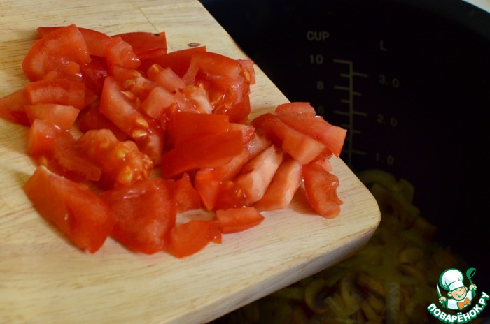 Добавляем томатную пасту, разведенную кипяченой водой, солим и перчим по вкусу. Переключаемся на режим Тушение около 10 минут.